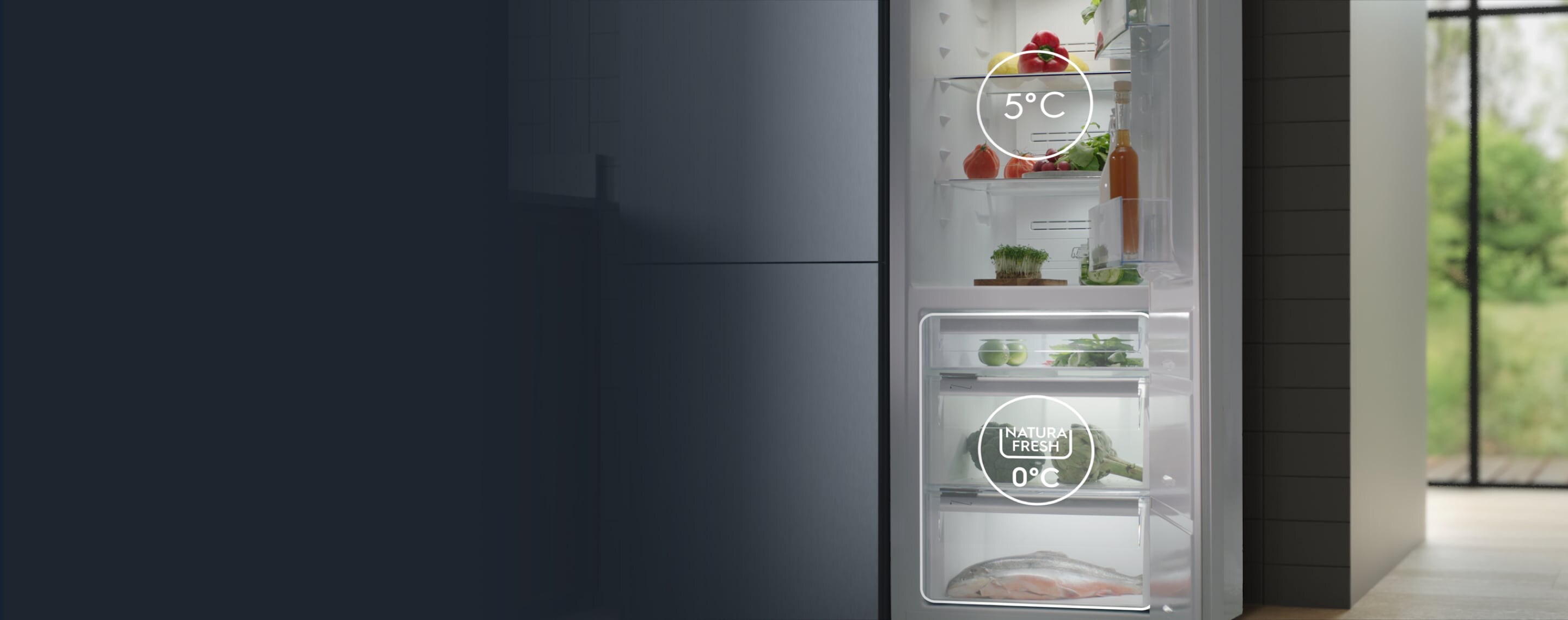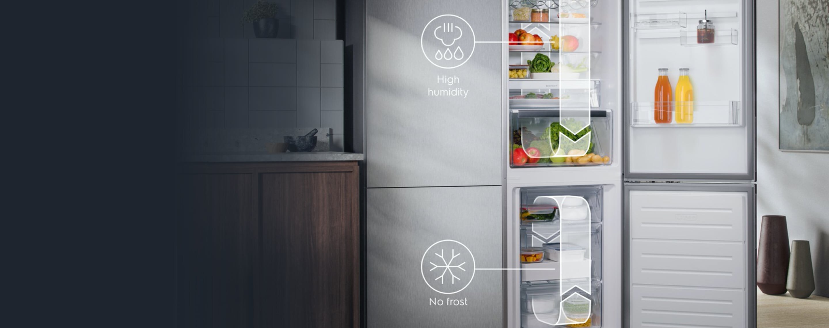 Naš asortiman hladnjaka sa zamrzivačem optimiziran je da bi zdrava prehrana postala jednostavna i održiva kako bismo vam omogućili da čuvate ono što je bitno – svoju prehranu, zdravlje i planet. Čuvamo kvalitetu namirnica uz tri ključna elementa: stalnu temperaturu, pravu razinu vlage i zatvorenu okolinu.