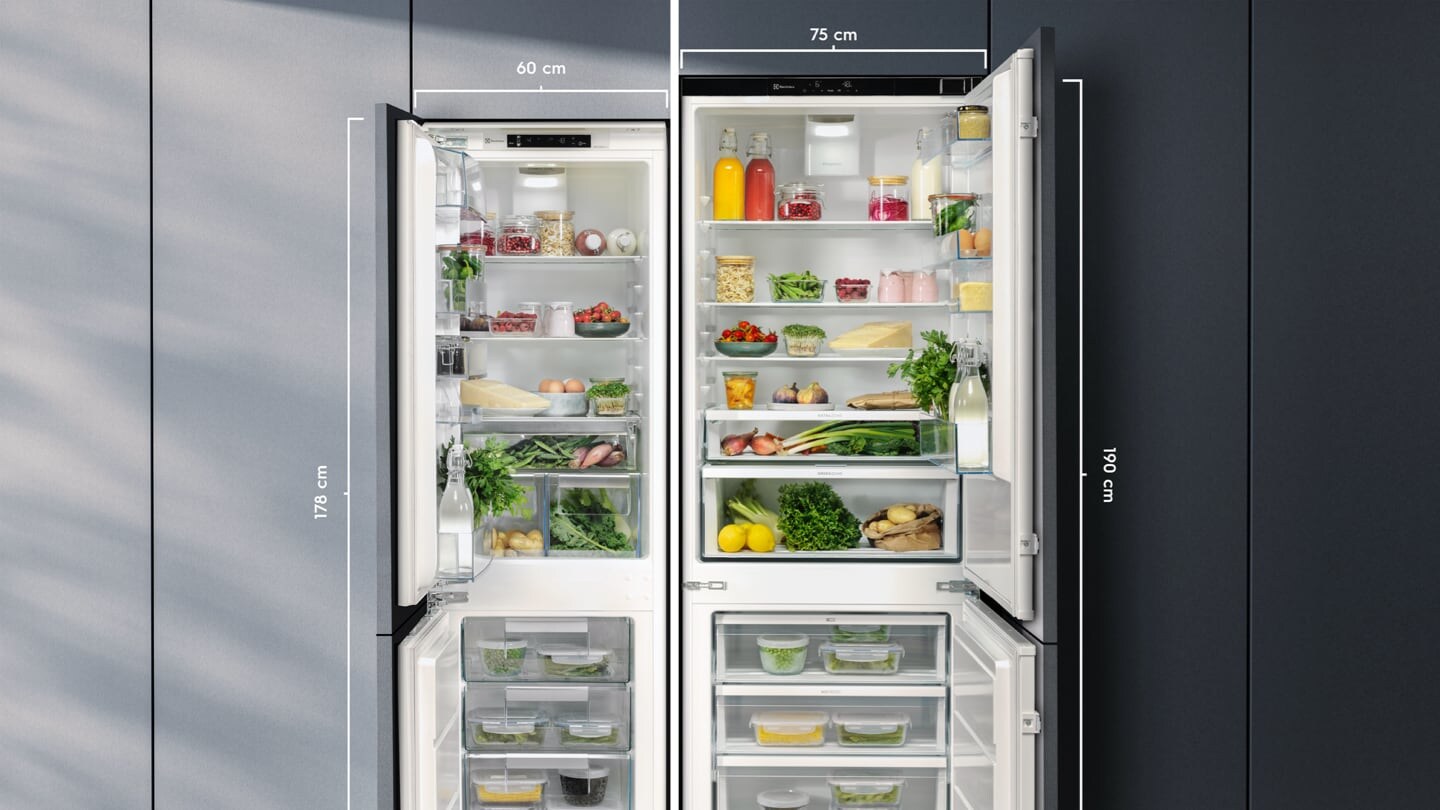 Integrirani hladnjaci sa zamrzivačem uobičajeno dolaze u standardnoj veličini da biste ih mogli smjestiti u ormariće, dok se samostojeći modeli razlikuju ovisno o visini i širini. Veličina naših niša kreće se u rasponu od 60 pa sve do 190 centimetara, u slučaju hladnjaka sa zamrzivačem MaxiSpace koji ima 45 % veći kapacitet od standardnih ugradbenih modela. Sve dimenzije dostupne su na našim stranicama proizvoda.