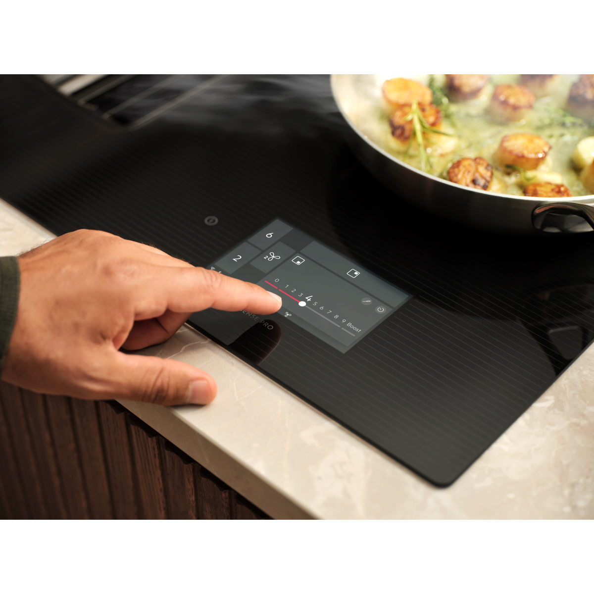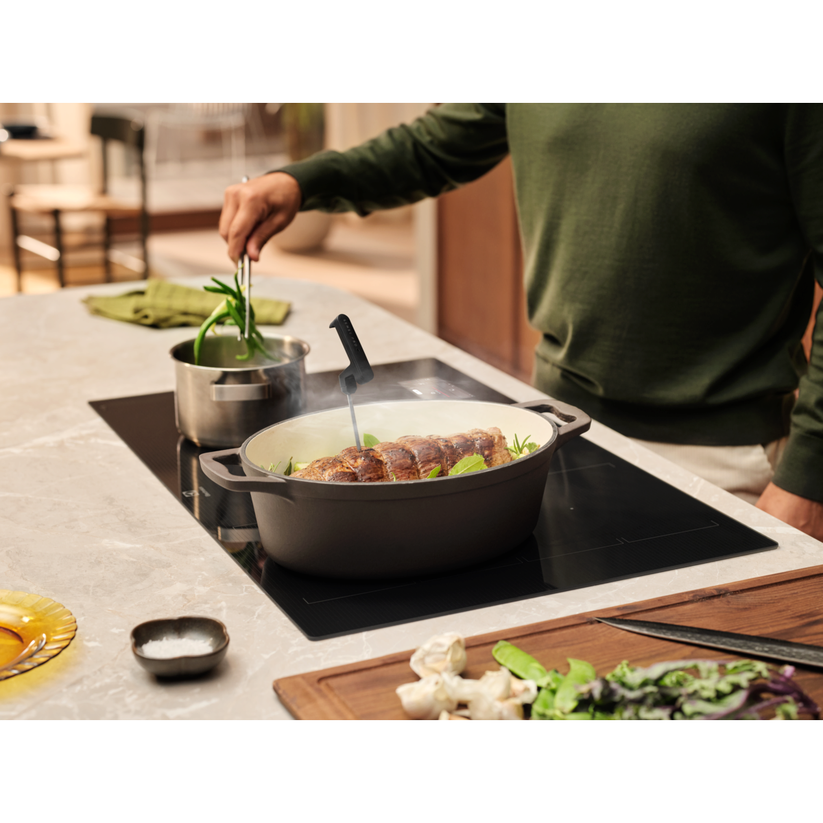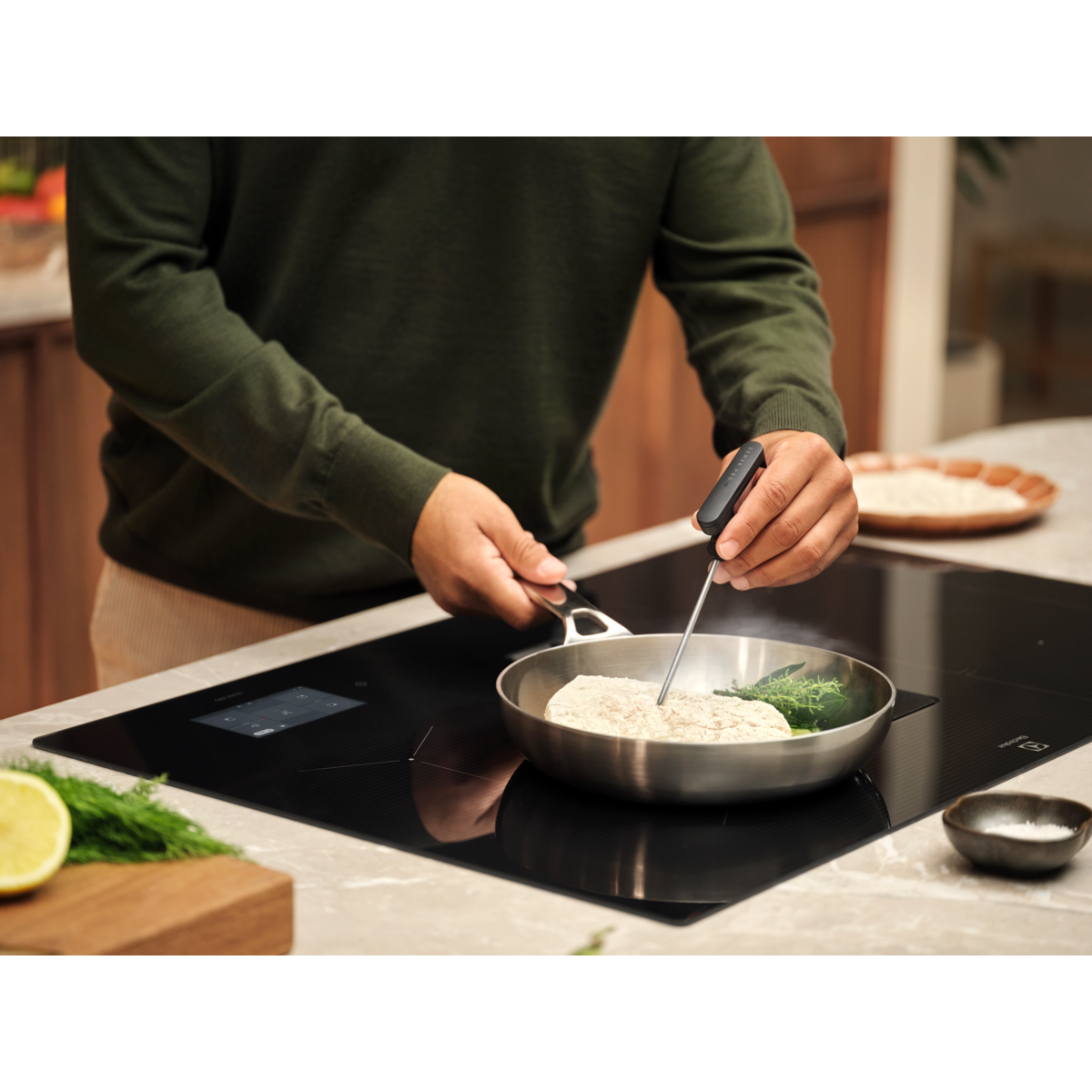 900 SensePro ploča za kuhanje s kuhinjskom napom ima snažnu ugrađenu kuhinjsku napu za optimalan protok zraka i bežični senzor za precizno kuhanje. Mjeri temperaturu hrane i automatski prilagođava postavke za preciznu toplinu – nema više nagađanja.