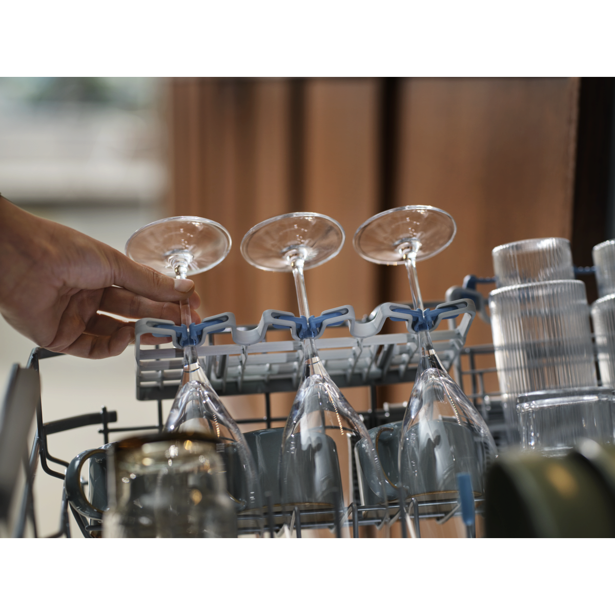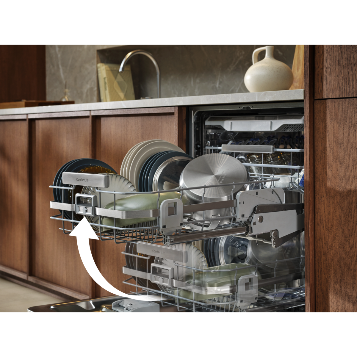 Donja košara puna posuđa podiže se 25 cm pomoću ojačanih šarki.
