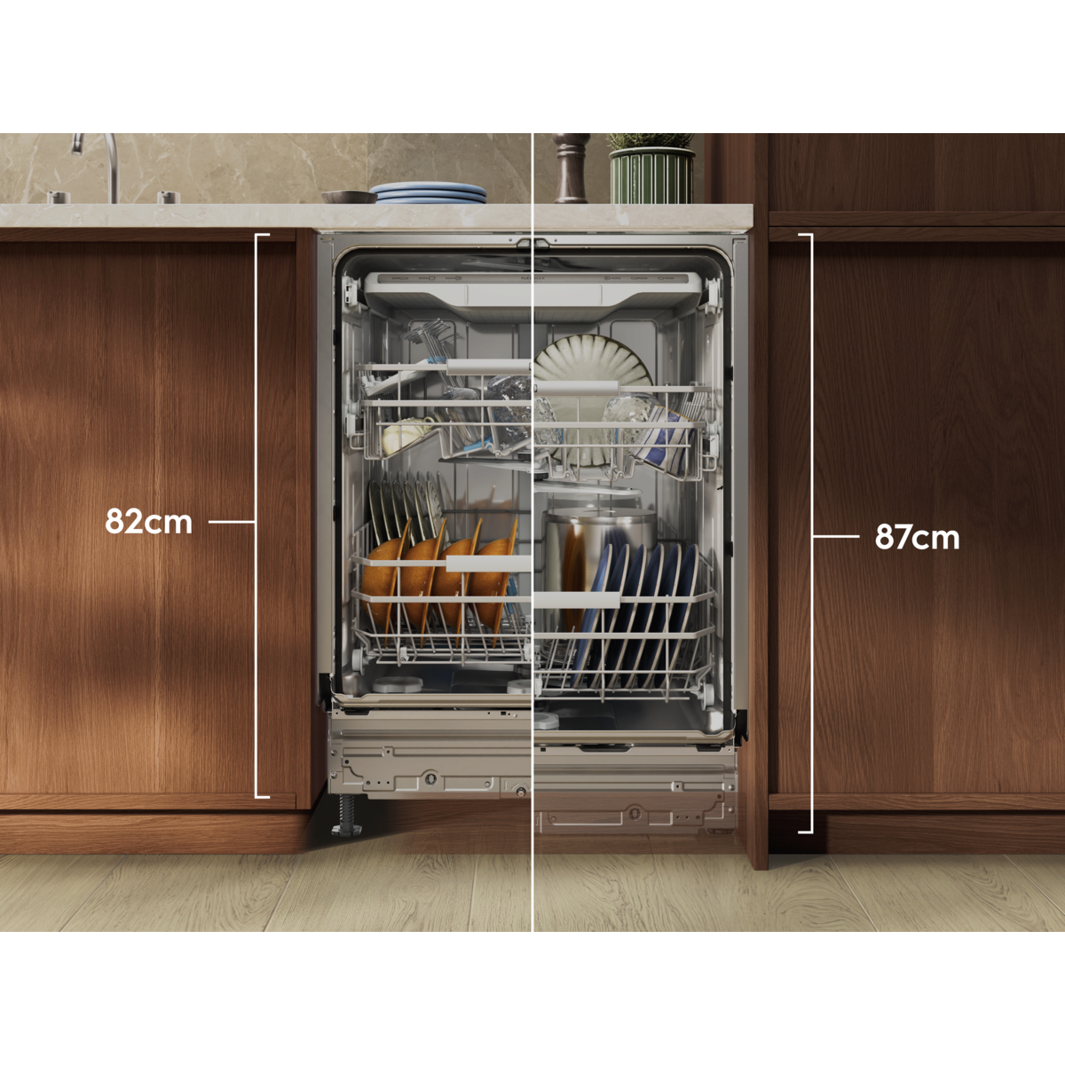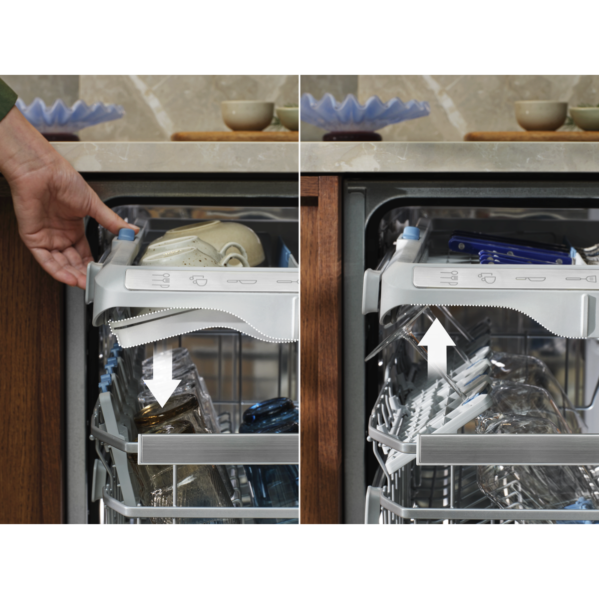 Donja košara puna posuđa podiže se 25 cm pomoću ojačanih šarki.