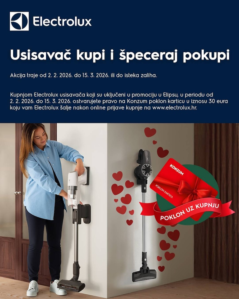 Kupnjom odabranih modela Electrolux usisavača u Elipsu, ostvarujete pravo na Konzum poklon karticu u vrijednosti od 30 EUR uz obaveznu online prijavu kupnje.