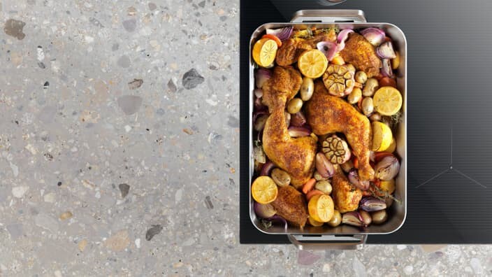 Naše Infinite samopodesive zone za kuhanje pametno prepoznaju različite veličine i oblike posuda, a zatim usmjeravaju toplinu na podlogu ispod svake posude.* Stoga sve svoje posude možete postaviti na ploču zajedno kako biste istovremeno pripremili nekoliko ukusnih jela.