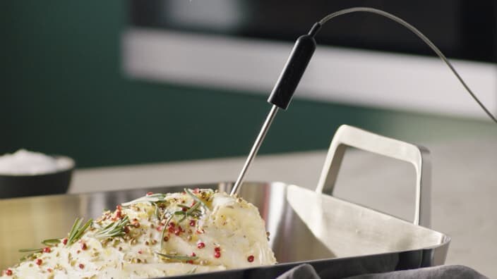 Zahvaljujući našoj sondi za hranu, svaki put možete s lakoćom postići savršene rezultate. Jednostavno umetnite sondu u svoje jelo i ona će pratiti njegovu središnju temperaturu. Upozorava vas kada se postigne željena temperatura i automatski zaustavlja kuhanje. Izbjegnite nedovoljno kuhane ili prekuhane namirnice uz našu sondu za hranu.